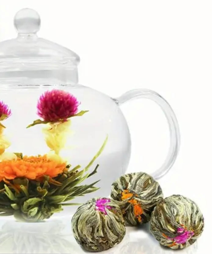 Turn tea time into a beautiful ritual with our Blooming Tea Collection—a stunning set of 12 hand-tied floral tea balls, each crafted with premium green tea leaves and naturally dried, edible flowers. Just drop a tea ball into hot water and watch it unfurl into a breathtaking blossom—steeping your cup in delicate flavor, soothing aroma, and pure artistry.
